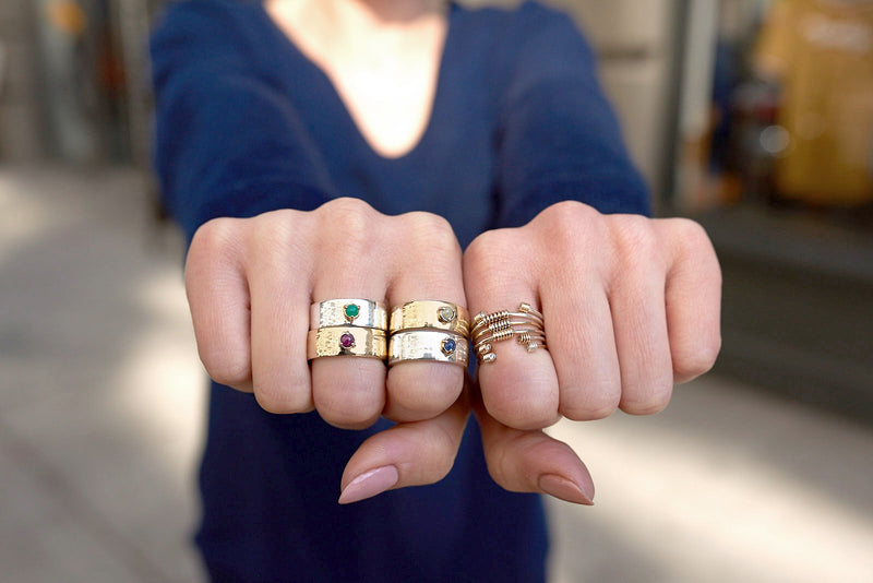 "Liquid Metal" Sterling Silver with 14K Gold narrow Hammered Band with Seven Diamonds