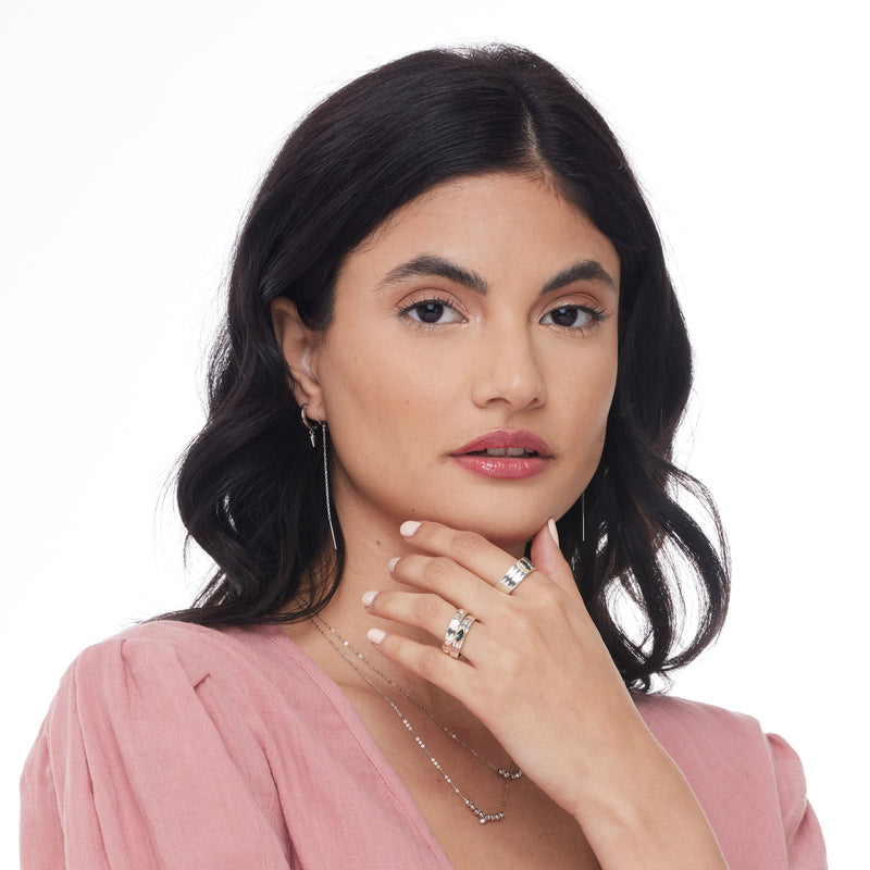 "Liquid Metal" Sterling Silver with 14K Gold narrow Hammered Band with Seven Diamonds