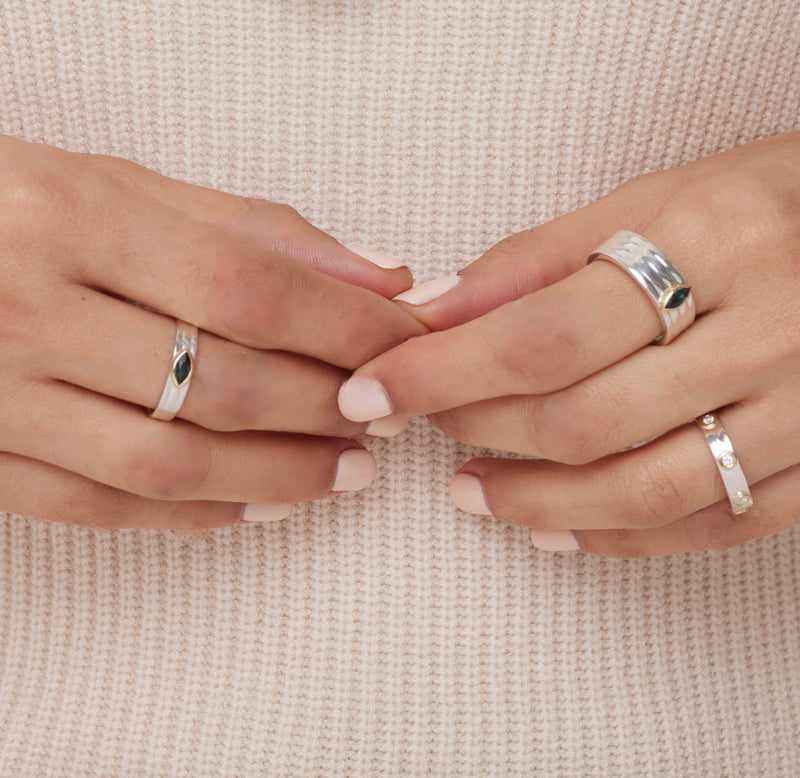 "Liquid Metal" Sterling Silver Wide Hammered Band with KNIFE EDGE Gemstone: Teal Tourmaline