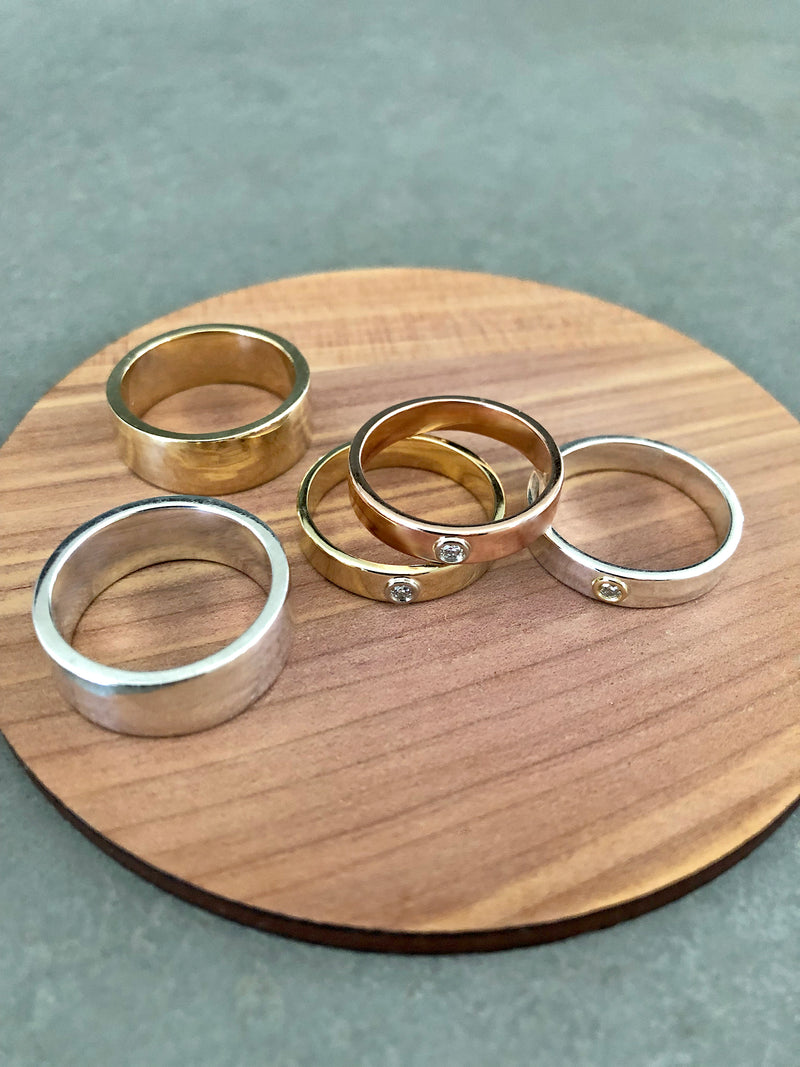 "Liquid Metal" 14K Gold narrow Hammered Band with Seven Diamonds